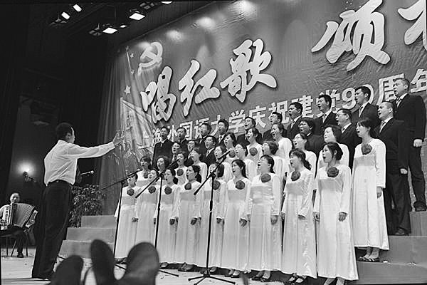 “唱红歌 颂祖国”———上外庆祝建党90 周年歌咏比赛5 月 20 日在松江校区教育会堂举行,全校有30 支队伍参赛参演,图 为英语学院教职工演唱《长征》情境。 胡欣华摄