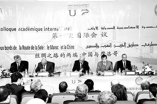 以“丝绸之路的两端———中国与摩洛哥”为主题的首届国际学术研讨会,11月24日至26日在摩洛哥卡萨布兰卡市成功举行。(见右图)上外校长曹德明致信祝贺,并盛情邀请各国学者出席将于2016年在上海举行的第二届“丝绸之路的两端———中国与摩洛哥”国际学术研讨会。摩洛哥王宫发言人、历史学家梅里尼,中国驻摩洛哥大使孙树忠,文化参赞石岳文,经商参赞景宁,摩洛哥高教与科研部部长特别代表杰米莱·米斯里,哈桑二世大学校长曼苏尔等嘉宾到会祝贺。上外科研处处长王有勇代表上外接受举办2016年国际学术研讨会的法槌。