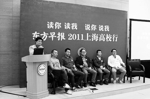 在互动环节里,上外学子与“东早”来 宾就该报以往报道、定位等对话。对“东 早”在去年“11·15 事件”报道中,头版使用 大幅广告引起争议一事,邱兵当场接受批 评,并诙谐表示,事发当天“是这几年来比 较‘猥琐’的一天”。