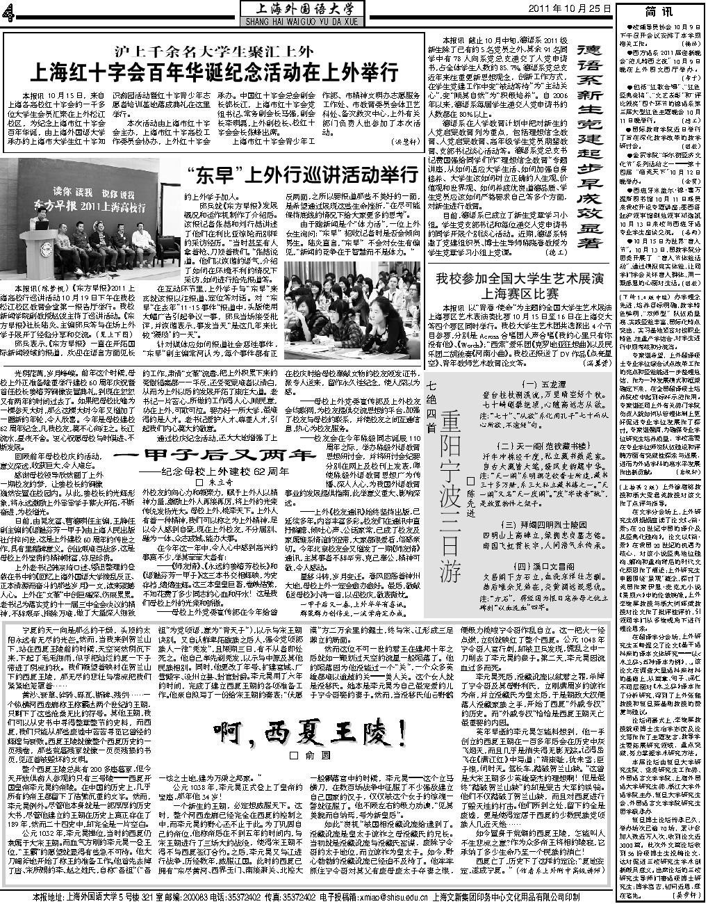 光阴荏苒,岁月峥嵘。前年这个时候,母 校上外正准备隆重举行建校60 周年庆祝暨 首任校长姜椿芳铜像安置典礼,到现在忽忽 又有两年的时间过去了。如果把母校比喻为 一棵参天大树,那么这棵大树今年又增加了 一圈新的年轮,令人欣喜。今年是母校建校 62 周年纪念,凡我校友,莫不心向往之。长江 流水,昼夜不舍。衷心祝愿母校与时俱进、不 断发展。