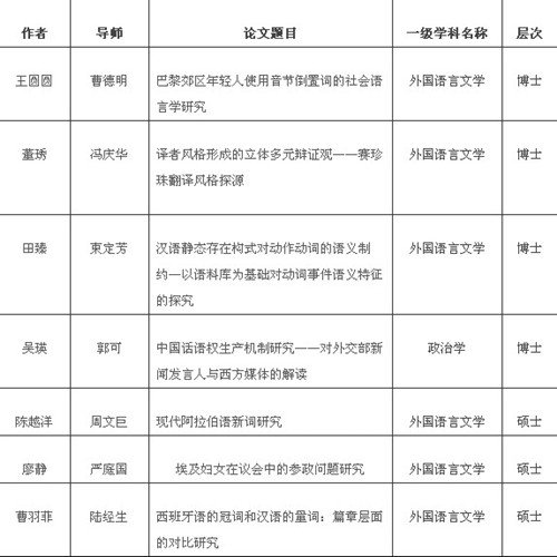 在144 篇获奖博士论文中,人文社科类有 24 篇,我校王圆圆、董琇 、田臻、吴瑛撰写的的博 士论文跻身其中,包揽外国语言文学和政治学两 个一级学科获奖名额。在133 篇获奖硕士学位论 文中,人文社科类有38 篇,外国语言文学一级学 科有5 篇论文获奖,我校占有3 篇。这是上海市 每年优秀学位论文评选开展以来,我校博硕士学 位论文评优所取得的最佳成绩。 (岩雪萱)