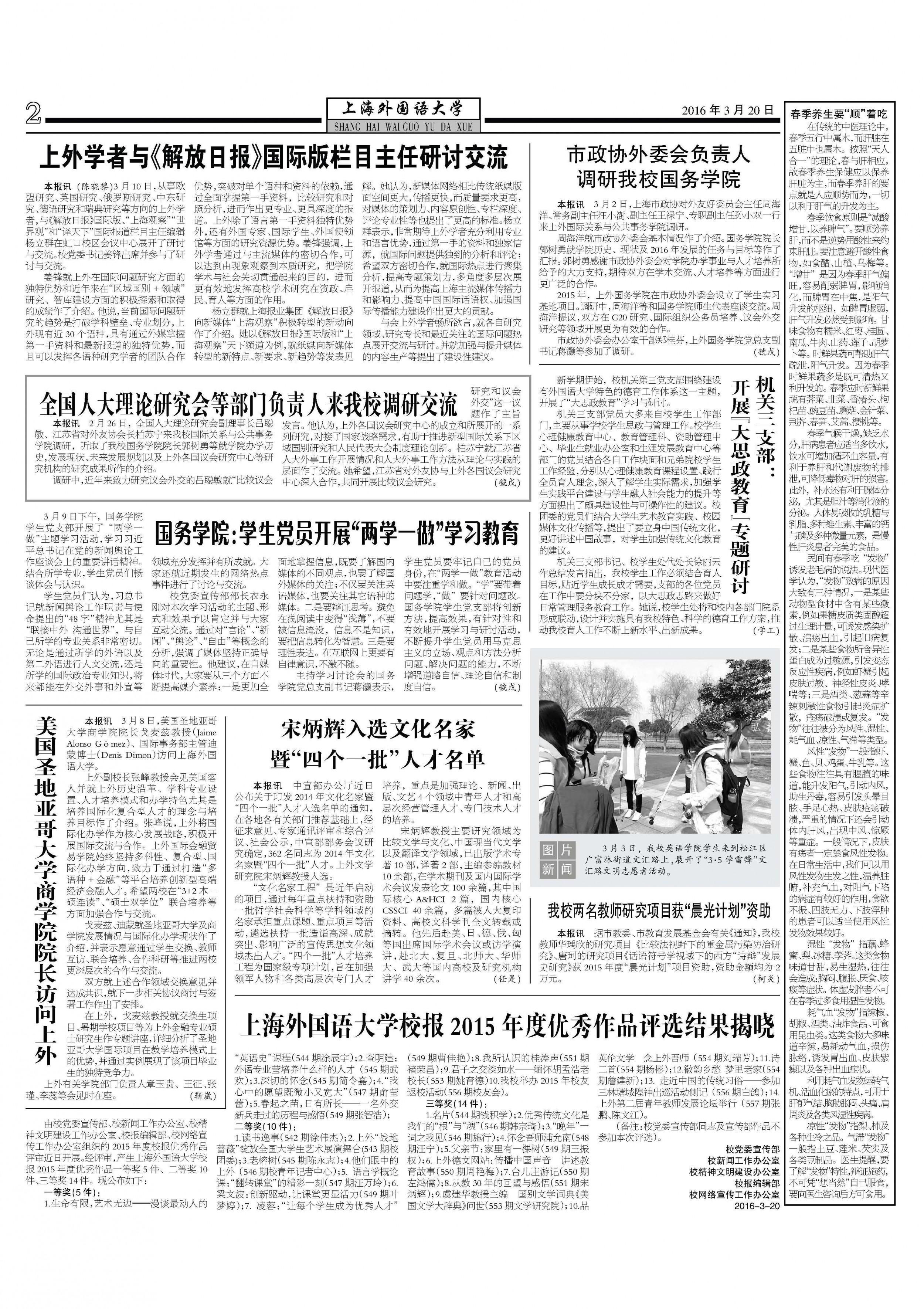 1.读书逸事(542期徐伟杰);2.上外“战地蔷薇”绽放全国大学生艺术展演舞台(543期校团委);3.老榕树(545期陈永志);4.他们眼中的上外(546期校青年记者中心);5.语言学概论课:“翻转课堂”的精彩一刻(547期汪万玲);6.梁文波:创新驱动,让课堂更显活力(549期叶梦婷);7.凌蓉:“让每个学生成为优秀人才”(549期曹佳艳);8.我所认识的桂涛声(551期褚荣昌);9.君子之交淡如水———缅怀胡孟浩老校长(553期姚育德)10.我校举办2015年校友返校活动(556期校友会)。