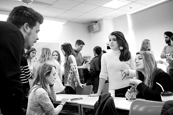 图为首批 IMBA 双学位研究生在新学期说明会上咨询交流