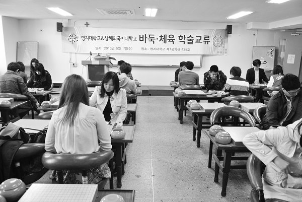 在4月30日举行的学术论坛上,上外围棋队队长、日本文化经济学院2009级学生尹航作了题为《中日围棋杂志的比较》的报告,这是上外建校以来首位本科生在国际围棋学术论坛上作报告,得到了与会中韩专家的肯定。在5月1日举行的友谊对抗赛上,双方围棋队以棋会友。东道主以16:8的较大比分获胜。(见下图)在韩期间,上外代表团还观摩了在首尔举办的韩国职业棒球联赛。