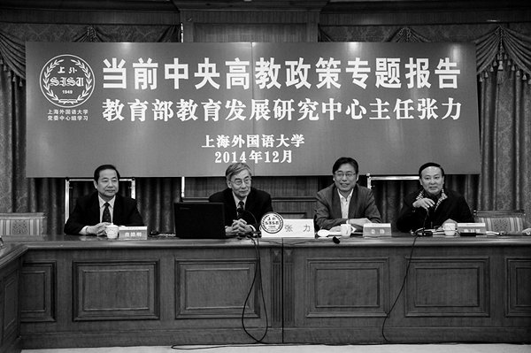 本报讯(缪迅)12月1日上午,上海外国语大学党委中心组举行学习贯彻党的十八届三中全会、四中全会精神专题报告会,教育部教育发展研究中心主任张力应邀作了题为“学习贯彻十八届三中、四中全会精神,推进教育治理体系和治理能力现代化”的报告。上外领导姜锋、李月松、王静、周承、林学雷和各部门中层干部80余人听取了报告。(见下图)报告会由上外党委宣传部部长陈万里主持。