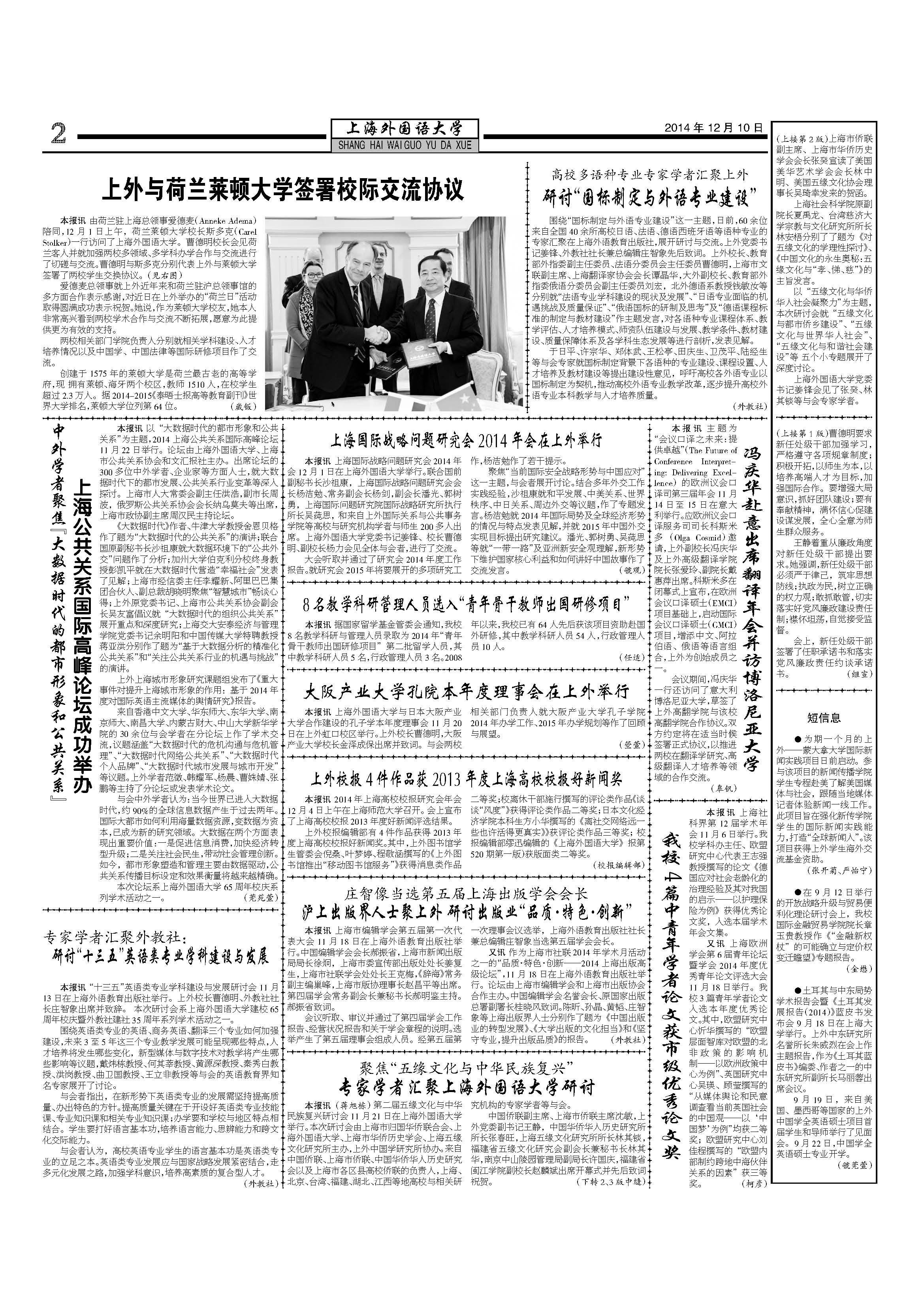 (张开菊、严怡宁)●在9月12日举行的开放战略升级与贸易便利化理论研讨会上,我校国际金融贸易学院院长章玉贵教授作《“金融新权杖”的可能确立与定价权变迁瞻望》专题报告。(金懋)●土耳其与中东局势学术报告会暨《土耳其发展报告(2014)》蓝皮书发布会9月18日在上海大学举行。上外中东研究所名誉所长朱威烈在会上作主题报告,作为《土耳其蓝皮书》编委、作者之一的中东研究所副所长马丽蓉出席会议。
