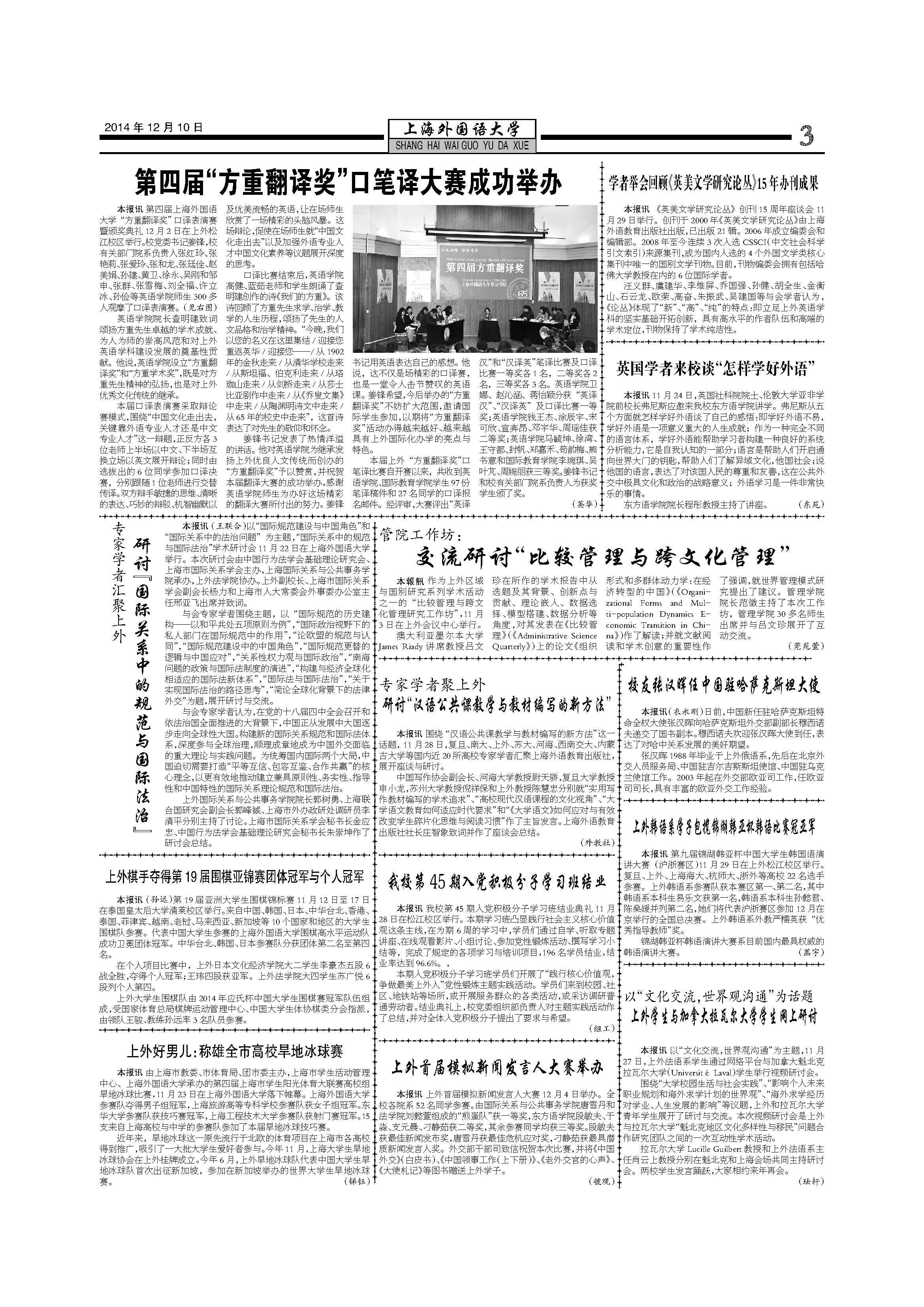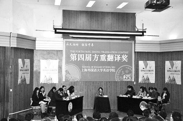 本报讯第四届上海外国语大学“方重翻译奖”口译表演赛暨颁奖典礼12月2日在上外松江校区举行。校党委书记姜锋,校有关部门院系负责人张红玲、张艳莉、张爱玲、张和龙、张廷佺、赵美娟、孙建、黄卫、徐永、吴刚和邹申、张群、张)梅、刘全福、许立冰、孙俭等英语学院师生300多人观摩了口译表演赛。(见右图)英语学院院长查明建致词颂扬方重先生卓越的学术成就、为人为师的崇高风范和对上外英语学科建设发展的奠基性贡献。他说,英语学院设立“方重翻译奖”和“方重学术奖”,既是对方重先生精神的弘扬,也是对上外优秀文化传统的继承。