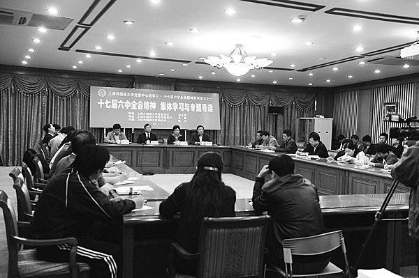 本报讯(衣永刚时雁)校党委中心组(扩大)学 习11 月17 日下午在虹口校区会议中心英伦厅举 行。校党委书记吴友富、副书记王静、副校长杨力就 学习和贯彻落实党的十七届六中全会精神作了辅导 报告。校领导冯庆华、张峰、周承,校党委常委、校长 助理庄智象出席集体学习报告会。校党委宣传部部 长陈万里主持了集体学习。(见下图)吴友富就中共中央政治局委员、上海市委书 记俞正声在九届市委十六次全会上的讲话精神作 了传达,并结合我校实际,学习和贯彻落实十七届 六中全会精神作整体部署。吴友富要求全校各部 门院系组织师生员工认真学习十七届六中全会精 神,特别是要认真通读并读通、读懂十七届六中全 会通过的《决定》,要组织专题讨论交流会、深化学 习的有效性。