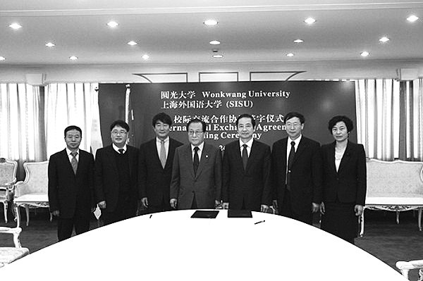 本报讯(廖静)上海外国语大学与韩国 圆光大学校际交流合作协议签字仪式11 月 24 日上午在虹口校区凯旋厅举行。(见右 图)上外校长曹德明及对外交流合作处处长 张红玲、东方语学院院长严庭国,东方语学 院副院长金基石;韩国圆光大学校长丁世铉 及国际交流室室长金锡禹,中文系主任朴元 基等出席了签字仪式。曹德明、丁世铉分别 代表上外和圆光大学在校际合作协议上签 字。曹德明表示,圆光大学和上外办学理念 有着诸多共同之处,(下转第1、4 版中缝)