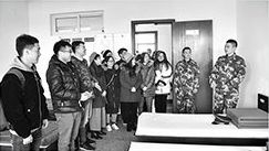 12月16日,法学院师生党员走进驻沪武警某部队,就加强基层党组织建设座谈交流,开展“走进军营、支部共建”主题党日活动。图为师生党员们参观部队营房。 (珐轩)