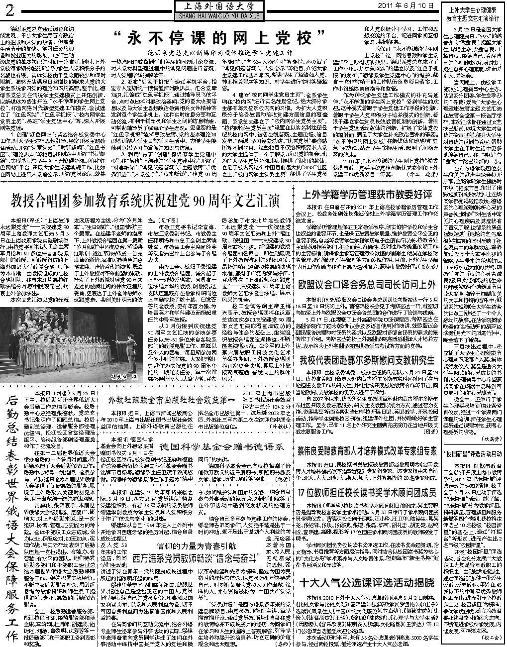 胡欣华摄本报讯(缪迅)“上海教师永远跟党走”———庆祝建党90周年上海教师文艺汇演6月3日在上海戏剧学院实验剧场举行。由校党委副书记、工会主席李月松和60多位来自各院系部门的教授、副教授组成的上海外国