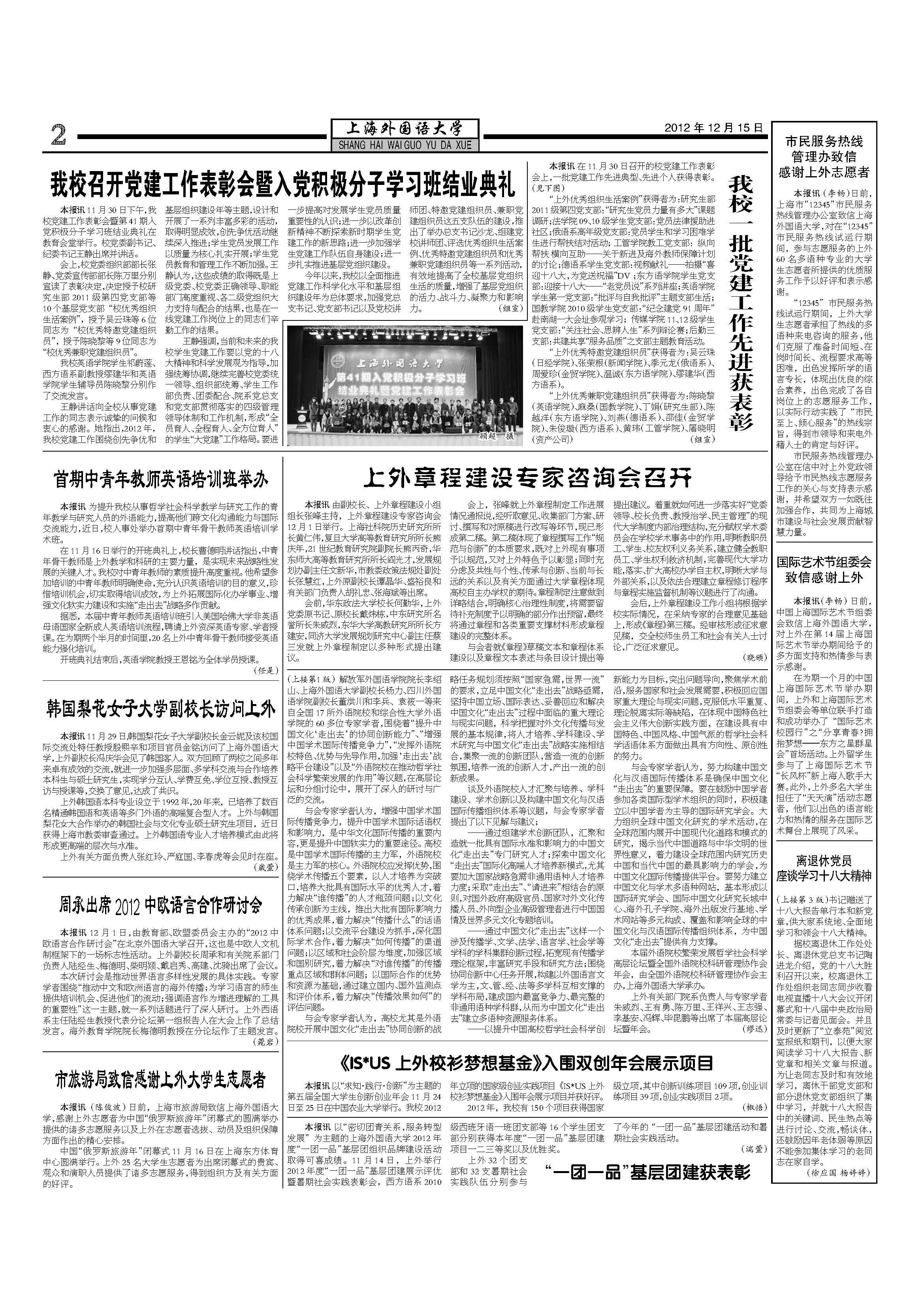 本报讯在11月30日召开的校党建工作表彰会上,一批党建工作先进典型、先进个人获得表彰。(见下图)“上外优秀组织生活案例”获得者为:研究生部2011级第四党支部:“研究生党员力量有多大”课题调研;法学院
